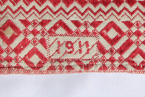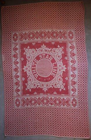 A similar 3rd Class blanket as pictured in the original White Star Line advertising brochure, this time minus a flag of central star. There was at least three designs for these blankets, in use from their introduction around 1911 until the company merger with Cunard in 1934, when a similar design in both red & blue was used featuring the new combined company name only without logo. This example has a date cade woven into the design in this case for c-1920.