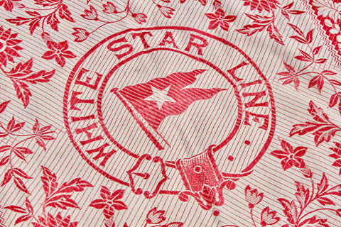 As already mentioned, the level of quality for each respective class onboard the ship was the highest of quality, and for passengers traveling by the lowest class, Third, the quality could be argued to be unsurpassed on the Atlantic. Covers were designed, again capturing the epitome of the gilded era, in a loose late victorian pre cursor to the Art Nouveau style. The design would change little being used or seen in publicity material from the early 1900's White Star Line ships through to the 1930's, similar designs still being used on the Queen Mary in 1936. Although not as refined as the damask covers found in the First & Second Class, the material was a hardy but comfortable cotton that again would withstand the rigours of life at sea in a floating hotel, hand washing or later industrial washing machines.